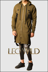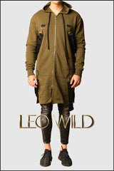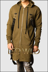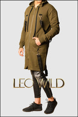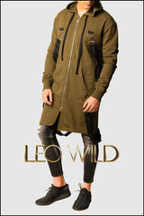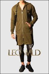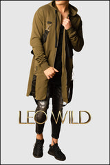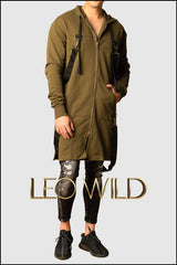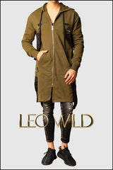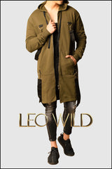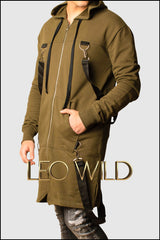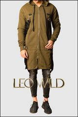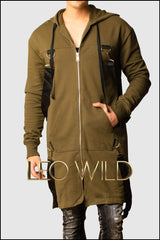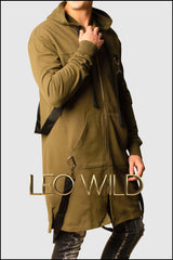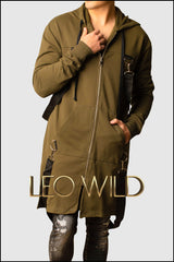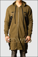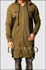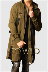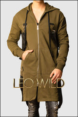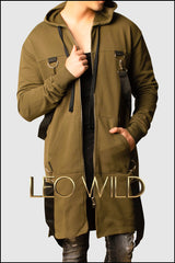 Men's Long Cardigan: Army Green Long Zip Up Hooded Jacket for Men