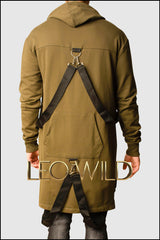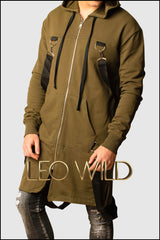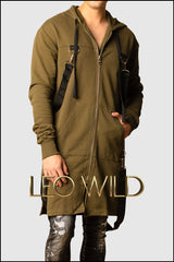 -Two side slits & two black straps with buckles are the main design features of this unique long hooded zip up cardigan for men