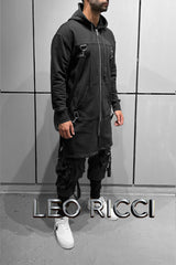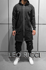 -Two side slits & two black straps with buckles are the main design features of this unique long hooded zip up cardigan for men