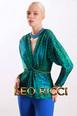 Green Leopard Print Silky Satin Blouse with Long Sleeves