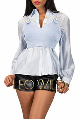 Update your everyday rotation of casual & elevated pieces with this contemporary Never Better Than My Pearl Bra Shirt Blouse in Baby Blue by LEO WILD™. With a long sleeves baby blue shirt and a stylish matching knitted bra with gorgeous pearl embellishments, this long sleeve pearl bra shirt blouse is perfect for dressing up for an evening event this season.