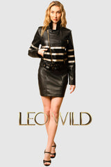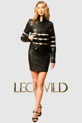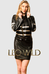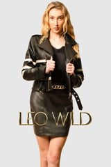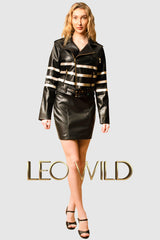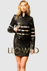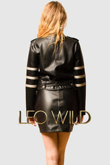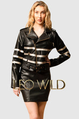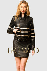 The astonishing contrasting three white horizontal lines across the waist & sleeves gives a true luxury feels to this edgy & sophisticated vegan leather biker jacket. Wear yours with a matching vegan leather mini skirt & ankle boots for an unforgettable look. This fully lined fitted, durable, and animal friendly jacket relaxes and conforms to your shape and breaks in perfectly.